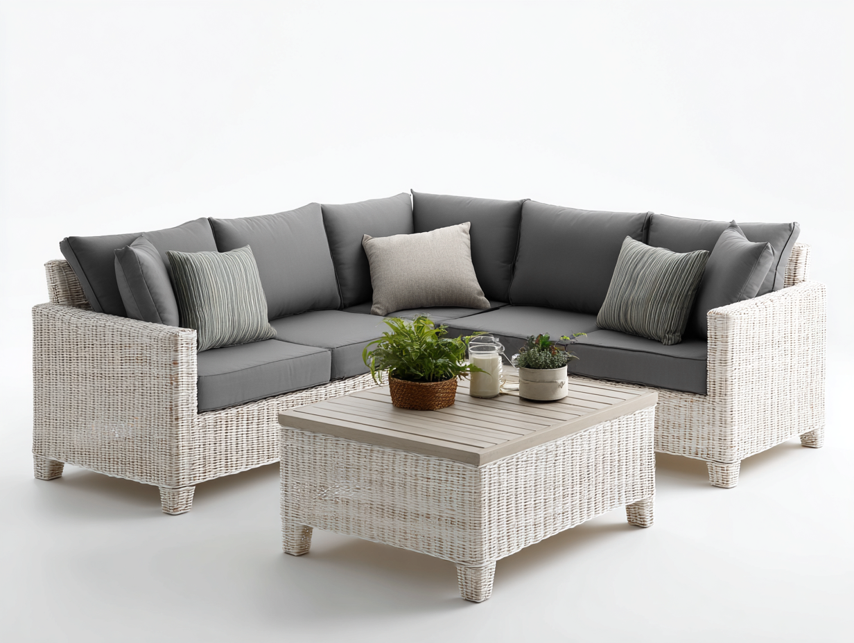 Das Gartensofa besteht aus langlebigem Polyrattan in Weiß, das auf einem stabilen Rahmen verarbeitet ist. Das Material ist widerstandsfähig gegenüber Witterungseinflüssen und eignet sich für den langfristigen Einsatz im Außenbereich. Die grauen Sitzflächen ergänzen das moderne Erscheinungsbild und sorgen für zusätzlichen Sitzkomfort.