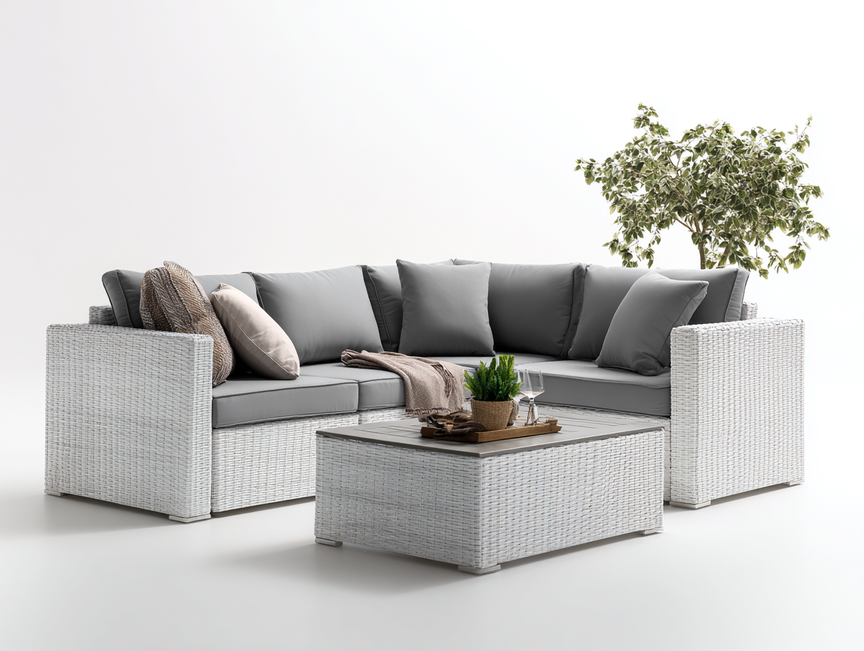 Das Gartensofa besteht aus strapazierfähigem Polyrattan in Weiß, das auf einem stabilen Rahmen verarbeitet ist. Das Material ist witterungsbeständig, pflegeleicht und für den langfristigen Einsatz im Außenbereich geeignet. Die grauen Sitzflächen ergänzen das moderne Erscheinungsbild und sorgen für zusätzlichen Sitzkomfort. Der Tisch ist ebenfalls mit Polyrattan ummantelt und passt optisch zum gesamten Set.