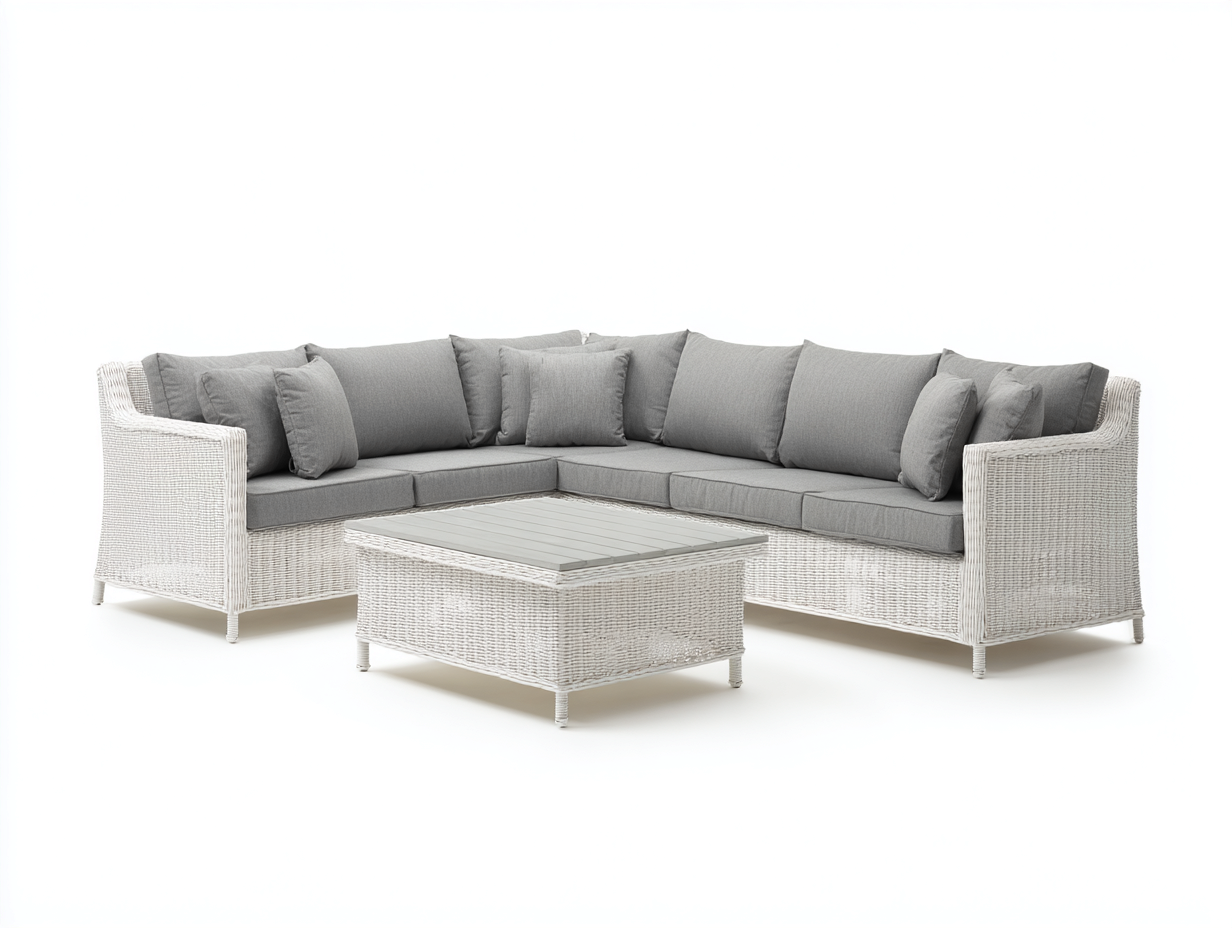 Das Gartensofa besteht aus strapazierfähigem Polyrattan in Weiß, das auf einem stabilen Rahmen verarbeitet ist. Das Material ist pflegeleicht und für den Einsatz im Außenbereich geeignet. Die grauen Sitzflächen ergänzen das moderne Erscheinungsbild und sorgen für zusätzlichen Komfort beim Sitzen. Der passende Tisch greift die gleiche Material- und Farbgestaltung auf und fügt sich stimmig in das Gesamtbild ein.