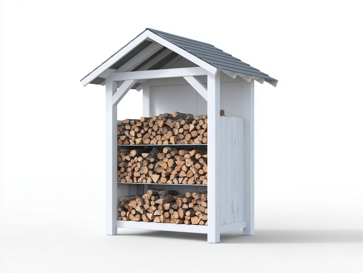 Das Kaminholzregal besteht aus stabil verarbeitetem Holz mit einer tragfähigen Rahmenkonstruktion. Die Oberfläche ist in Weiß gehalten und wird durch ein graues Dach ergänzt. Diese Kombination sorgt für eine moderne und zugleich zeitlose Optik. Das Dach schützt das gelagerte Holz vor Witterungseinflüssen und trägt zu einer langlebigen Nutzung im Außenbereich bei.