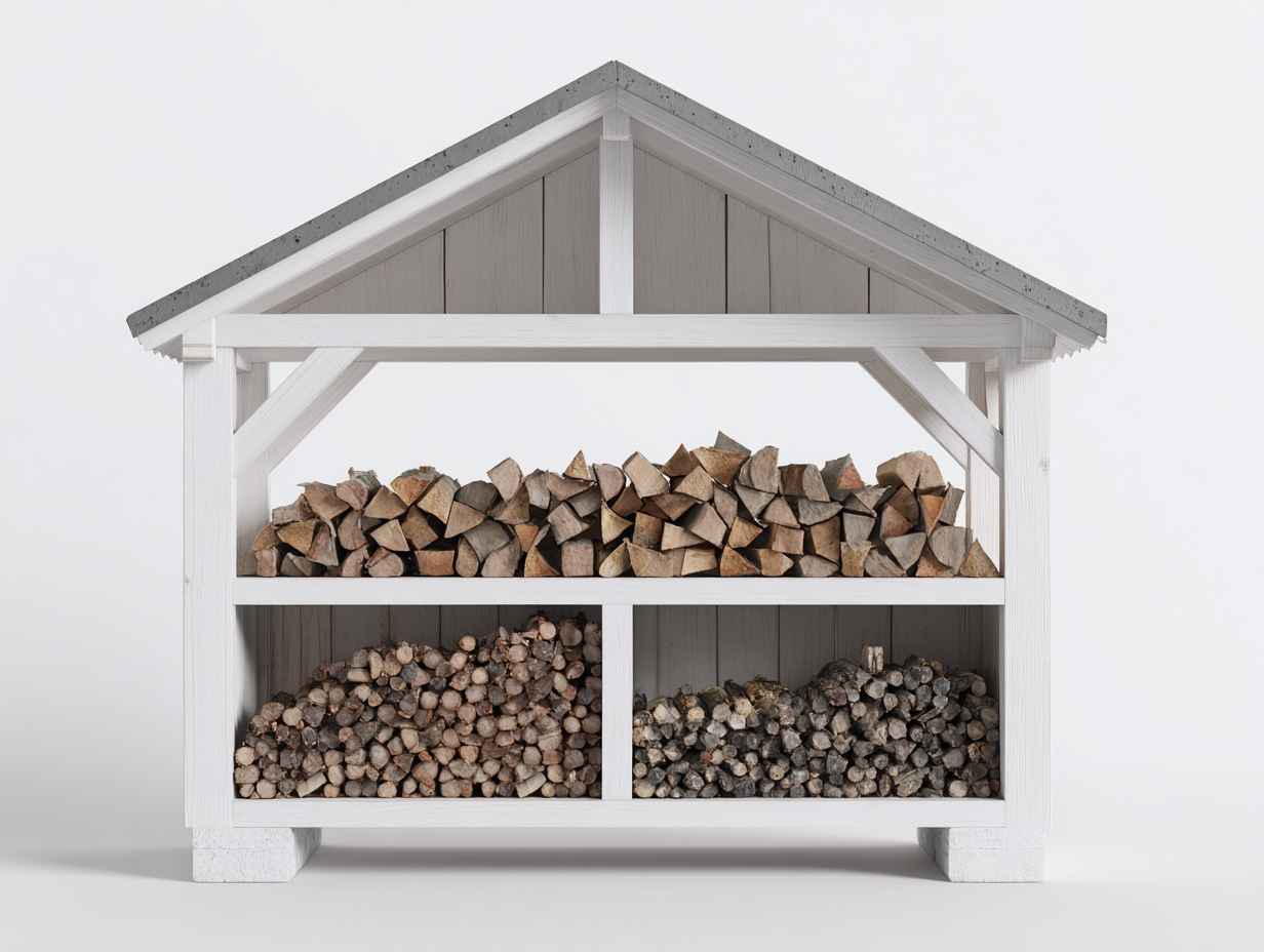 Das Kaminholzregal besteht aus einer stabilen Holzkonstruktion mit weißer Oberfläche. Das Dach ist mit einer grauen Abdeckung ausgestattet, die zusätzlichen Schutz vor Regen bietet. Die solide Bauweise sorgt für eine stabile Struktur und eine zuverlässige Nutzung im Außenbereich.