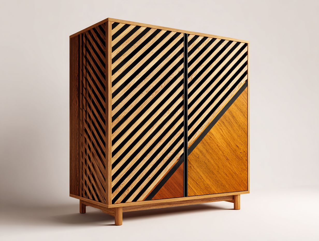 Dieser Kleiderschrank bietet eine kompakte Aufbewahrungslösung für das Schlafzimmer und kombiniert funktionalen Stauraum mit einem dekorativen Frontdesign. Die markante Gestaltung mit diagonalen Linien verleiht dem Möbelstück eine moderne geometrische Optik und schafft einen stilvollen Blickfang im Raum. Durch die kompakte Bauform eignet sich der Schrank besonders für Schlafzimmer oder kleinere Wohnbereiche.