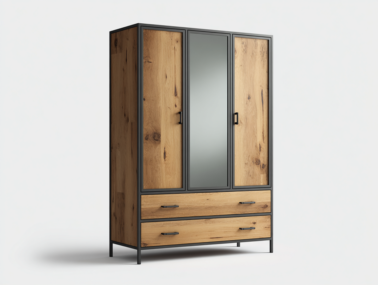 Der Kleiderschrank besteht aus stabilem Holzwerkstoff mit Eichenoptik in Naturfarbe. Der Rahmen und die Griffe sind in einer dunklen Metalloptik gehalten und bilden einen klaren Kontrast zur warmen Holzstruktur. Die Spiegelfläche ist fest in die Tür integriert und harmoniert mit der geradlinigen Gestaltung des Möbelstücks.