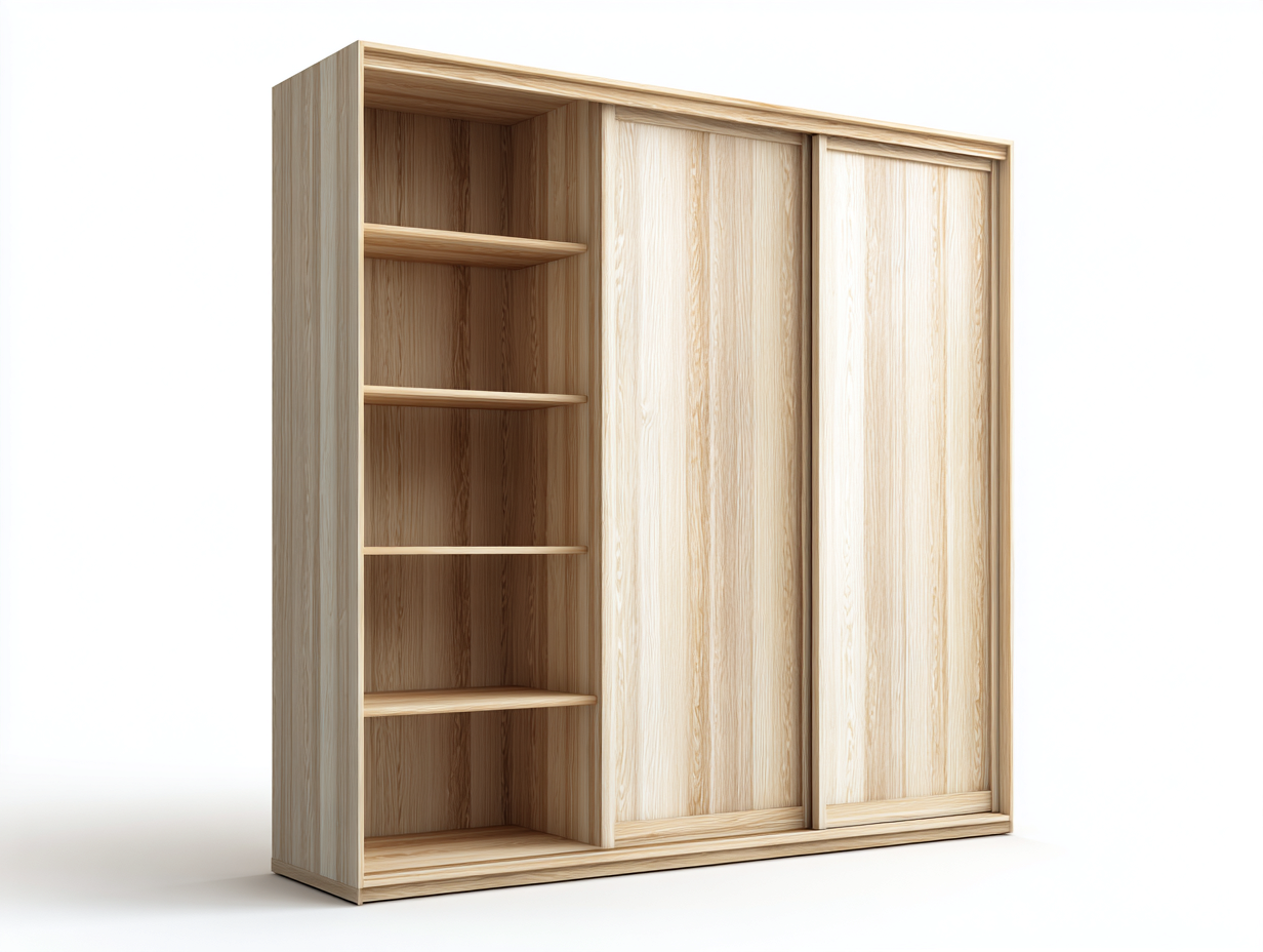 Die Schiebetüren ermöglichen einen komfortablen Zugang zum Innenraum und sparen gleichzeitig Platz vor dem Möbelstück. Der seitliche Regalbereich bietet zusätzlichen Stauraum für Kleidung, Aufbewahrungsboxen oder dekorative Elemente. Das klare Design erleichtert die Organisation von Kleidung und unterstützt eine übersichtliche Nutzung des Stauraums.