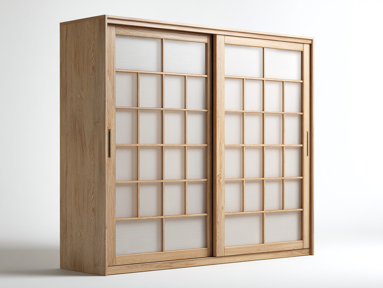 Dieser Kleiderschrank mit Schiebetüren bietet eine funktionale Aufbewahrungslösung für das Schlafzimmer. Das klare Design mit rechteckiger Struktur und dekorativen Türrahmen erinnert an einen japanisch inspirierten Einrichtungsstil und fügt sich harmonisch in moderne sowie minimalistische Wohnräume ein. Durch die Schiebetüren bleibt der Zugang zum Innenraum komfortabel auch bei begrenztem Platz vor dem Schrank.